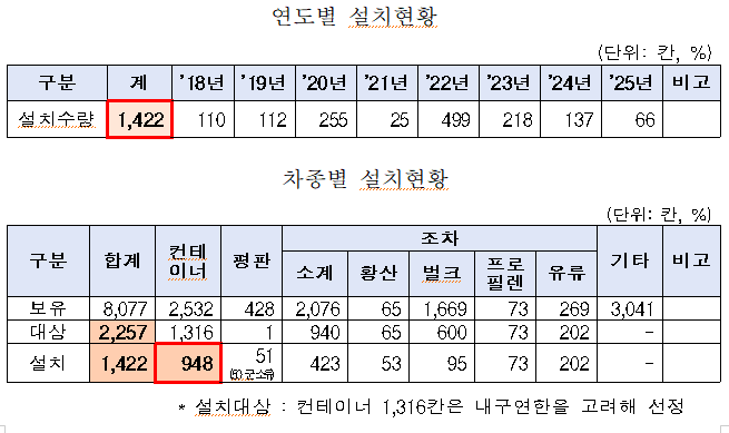 이 가운데 유류 또는 벌크 화차보다 상대적으로 무게가 가벼워 탈선 우려가 높은 컨테이너 화자에 집중되어 있는데 총 948칸으로 전체의 67%에 해당하는 장치가 컨테이너 화차에 설치되어 있다.