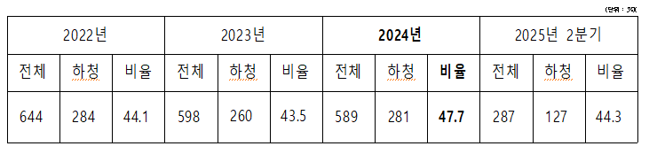 재해조사 대상 사망사고 중 하청노동자 비율은 2022년 44.1%(284명)에서 2023년 43.5%, (260명) 2024년 47.7%(281명)로 급증했다. 올해 2분기 기준 벌써 44.3%(127명)에 달한다.