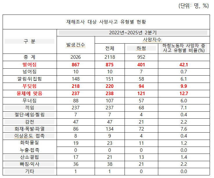 국회 환경노동위원회 간사 김주영 의원( 김포시갑)이 9일 고용노동부로부터 제출받은 <2022년~2025년 2분기 재해조사 대상 사망사고 현황>에 따르면, 산재 사망자 10명 중 4명 이상이 하청노동자인 가운데 대부분이 건설·제조·운수창고업 종사자인 것으로 확인됐다. 특히 떨어짐·물체에 맞음 등 재래형 사고가 원인으로 위험의 외주화가 심각하다는 지적이다.
