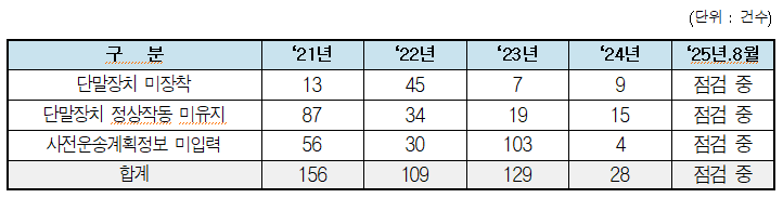 단말장치는 안전사고 예방 및 신속한 대응을 지원하기 위한 필수 장치인 만큼 장착 및 정상 작동 여부 확인이 중요하지만 공단에서 실시한 <법규 위반 적발 건수> 자료를 확인한 결과 위험물 적재차량 법규 위반 적발 건수는 2021년 156건, 2022년 109건, 2023년 129건 등으로 평균 100건 이상에 달하고 있다.