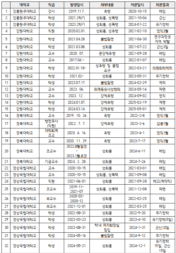 직급별로는 교수(정교수·부교수·조교수)가 68명, 학생이 67명으로 비슷한 수준이었다. 징계를 받은 교수 68명 가운데 9명은 감봉·견책 등 경징계에 그쳤으며, 25명은 정직·감봉 등 징계 이후 교단에 복귀했다. 즉, 한 학기가 끝나기도 전에 성비위로 징계를 받은 교수가 다시 교단에 서는 사례도 있다는 것이다.