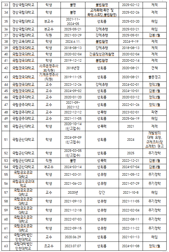 국회 교육위원회 소속 조국혁신당 강경숙 의원이 전국 39곳 국립대학교로부터 제출받은 자료에 따르면, 최근 5년간(2020~2025년 8월) 국립대학교 교직원과 학생의 성비위징계 건수는 161건으로 집계됐다.