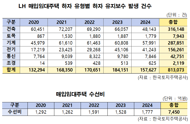 유형별로는 ▲건축부문 31만 6,148건 ▲기계부문 28만 7,851건 ▲전기부문 15만 6,261건 ▲통신부문 4만 2,751건 ▲토목부문 7,943건 ▲조경부문 2,119건 순으로 하자·유지보수 소요가 발생했다.