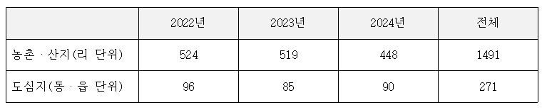 2022년부터 2024년까지 최근 3년간 1,762곳의 대상지를 분석한 결과 농촌·산지(리 단위)는 1,491곳으로 84.6%를 차지했다. 반면 도심지(동·읍 단위)는 271곳으로 15.3%에 그쳤다.
