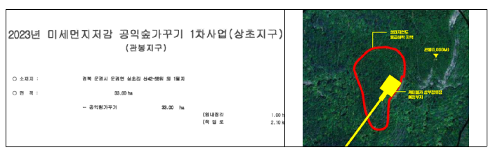 또한, 작업현장 사진과 현지조사 사진을 비교한 결과, 큰나무 위주의 간벌로 인해 식생이 단순화되고 산림 구조가 훼손된 정황이 확인됐다. ‘미세먼지 저감 숲가꾸기’의 실효성에 대한 의문도 제기된다.