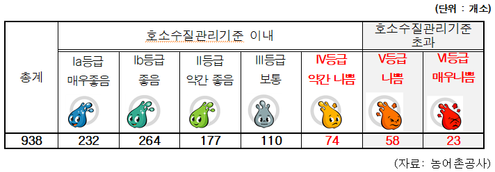 국회 농림축산식품해양수산위원회 김선교 의원(경기 여주시‧양평군)이 한국농어촌공사로부터 제출받은 <지자체별 공사관리 저수지 수질점검 결과>에 의하면, 농업용수 수질측정망조사 대상시설 938개소(저수지 922개소, 담수호 16개소) 중2025년 상반기 기준 ‘약간 나쁨(4등급)’ 이상인 곳은 155개소로, 전체 16.5%에 해당하는 저수지가 수질이 좋지 않은 상태로 확인됐다.