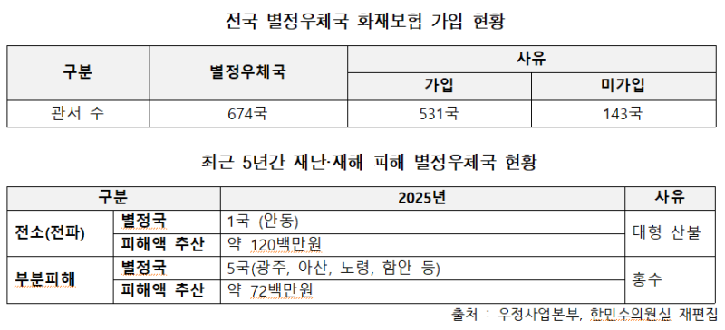 국회 과학기술정보방송통신위원회 소속 한민수 의원(더불어민주당, 서울 강북구을)이 우정사업본부로부터 제출받은 자료에 따르면, 전국 별정우체국 674국 중 143국(21%)이 화재보험에 미가입 상태인 것으로 확인됐다.