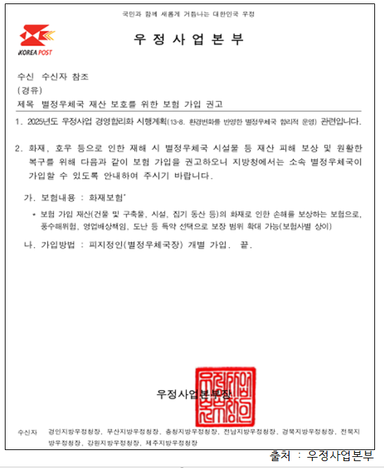 우정사업본부는 이번 사태 이후 “피해 지원 체계를 마련하겠다”고 밝혔으나, 아직까지 구체적인 대책이나 지원 계획은 내놓지 못한 상태다. 실제로 최근 5년간 별정우체국을 대상으로 한 화재보험 가입 안내 공문은 올해 8월 단 1건에 불과했으며, 향후 정기적인 보험 안내 계획도 없는 것으로 드러났다.