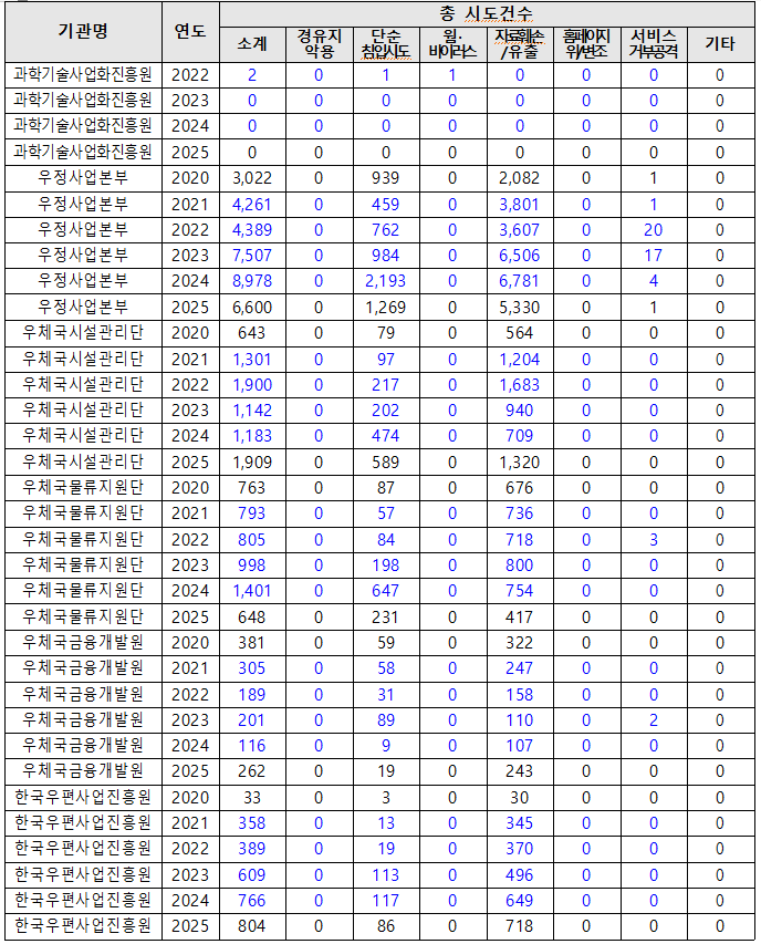 국회 과학기술정보방송통신위원회 소속 국민의힘 김장겸 의원이 과기정통부로부터 제출받은 자료에 따르면, 2020년부터 올해 8월 말까지 우정사업본부와 산하기관에서 탐지된 사이버 침해 시도는 5만2천656건에 달했다.