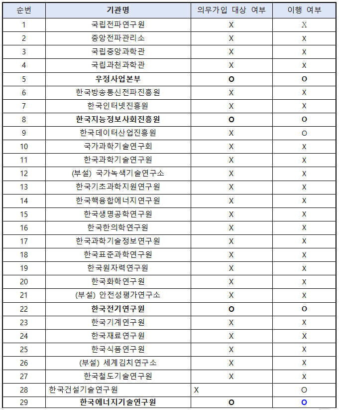 과기정통부 산하 다른 기관 중에는 의무 대상이 아님에도 자율적으로 가입한 사례도 있다. 한국데이터산업진흥원, 한국건설기술연구원 등 7곳이 임의로 보험에 가입한 것으로 확인됐다.
