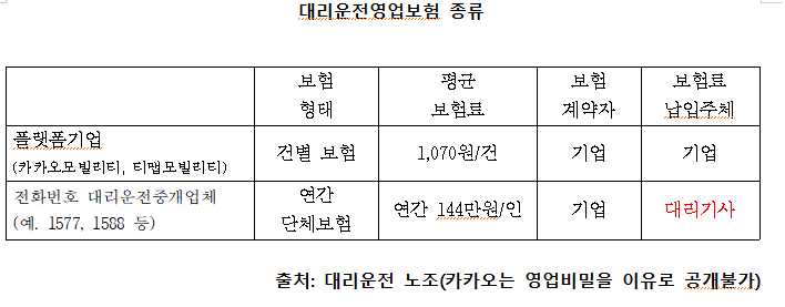 카카오는 앱을 통해 호출(콜)을 받을 때는 콜 1건당 약 1,070원의 보험료를 납부하고 있지만, 유선콜(전화 호출) 업체는 대리기사들이 1년에 144만 원의 보험료를 직접 부담하고 있다.