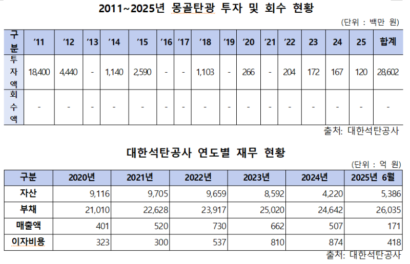 1994년부터 ‘32년째’ 완전자본잠식 상태 대한석탄공사... 최근 5년간 이자만 2,844억… 몽골 탄광 투자 실패 악재까지