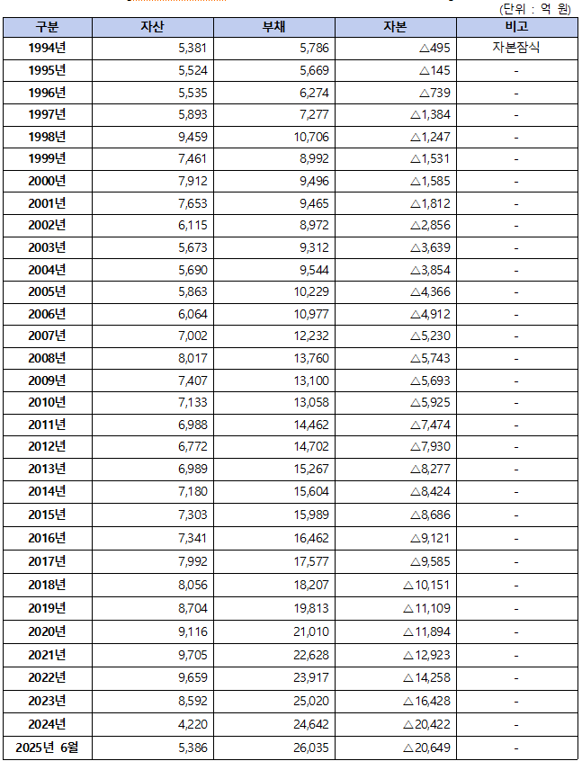 더욱 문제는 석탄공사는 2000년부터 32년째 완전자본잠식 상태로, 올해 6월 기준 자산 5,386억 원, 부채 2조 6,035억 원으로 여전히 부채가 자산을 상회하고 있다는 점이다.