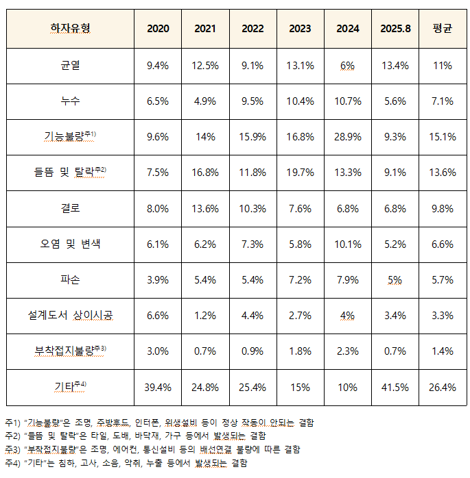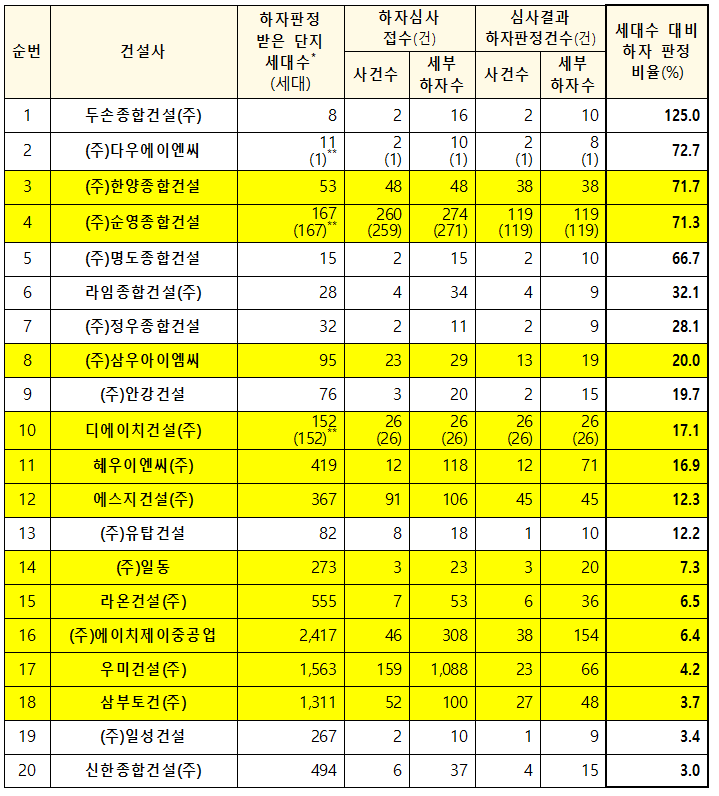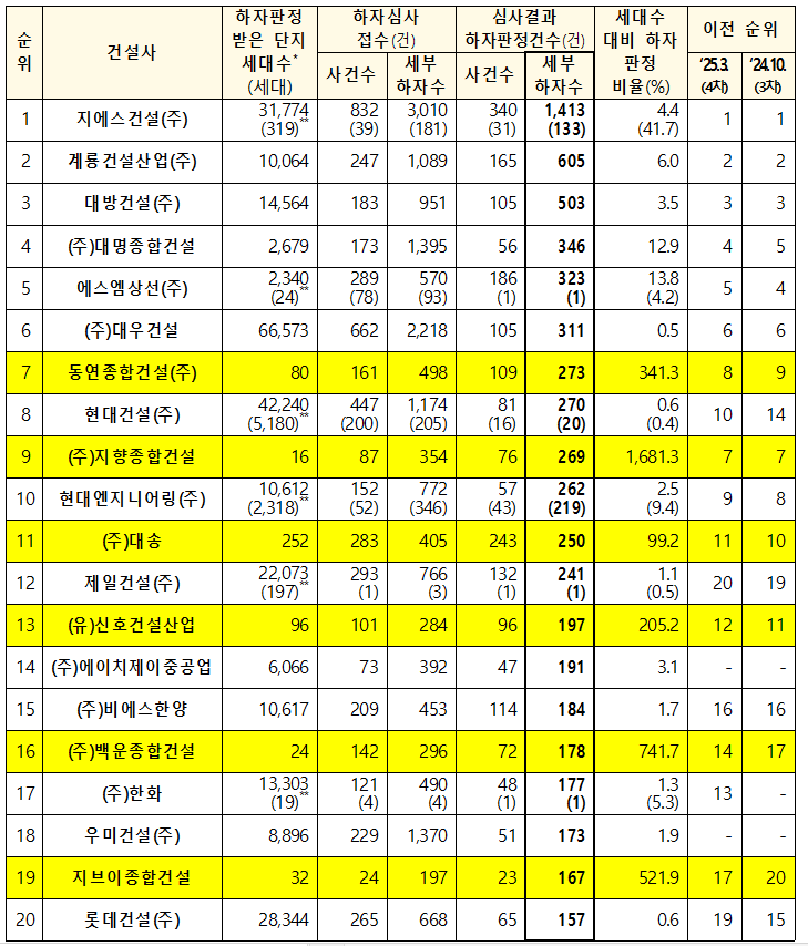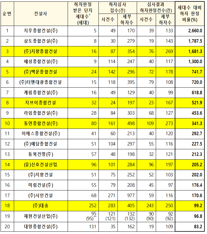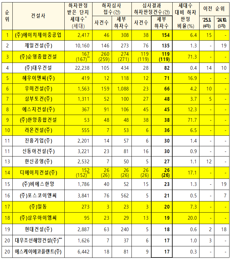 25년 하반기 공동주택 하자 판정 상위 20개 건설사 명단 공개...(주)에이치제이중공업, 제일건설, 순영종합건설,대우건설 순