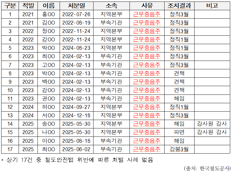 한편, 「철도안전법」 제41조는 철도종사자가 술을 마신 상태에서 업무를 해서는 안 된다고 규정하고 있으며 이를 위반할 경우 3년 이하의 징역 또는 3천만 원 이하의 벌금에 처하도록 하고 있다. 그러나 최근 5년(`21.~`25.10.) 간 한국철도공사 직원 17명이 근무 중 음주로 내부 징계를 받았지만, 이 중 수사기관 고발이나 형사입건으로 이어진 사례는 단 한 건도 없었던 것으로 드러났다.