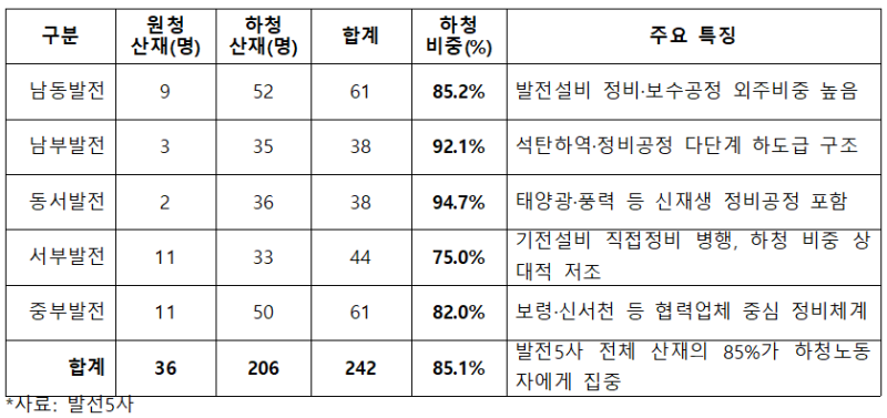 실제 서부발전 직원의 평균 연봉은 약 9,000만 원, 한전KPS는 8,200만 원인 반면, 민간하청업체 근로자는 3,800만 원 수준에 머물고 근속연수는 3년 이하로 나타났다.