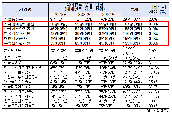 특히 한국광해광업공단, 한국가스안전공사, 한국석유관리원 등 5개 기관은 3년간 육아휴직자가 꾸준히 발생했지만, 대체인력은 단 한 명도 채용하지 않았다. 주무 부처인 산업부 역시 3년 동안 약 300명이 육아휴직을 신청했음에도 불구하고 대체인력 채용률은 단 2%에 불과했다.