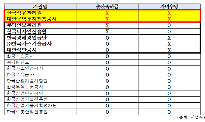 산업부 산하 공공기관의 출산축하금과 자녀수당 현황에 대해서도 전수조사한 결과, 한국석유관리원과 대한무역투자진흥공사는 두 제도를 모두 도입하지 않은 것으로 드러났다.