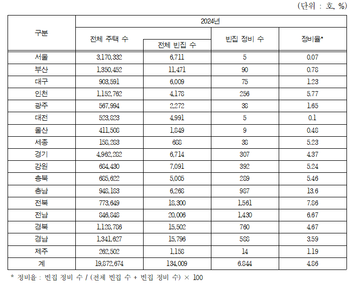 지역별로는, 충남이 13.6%의 빈집 정비율을 기록해 가장 높았으며, 다음으로 전북 7.86%, 전남 6.67%, 인천 5.77% 순으로 높았다. 반면, 서울은 빈집 정비율이 0.07%로 가장 낮았으며, 이어 부산 0.78%, 대전 0.1%, 제주 1.19%가 뒤를 이었다. 이에 저조한 빈집 정비에 대한 특단의 대책이 필요하다는 지적이 제기된다.