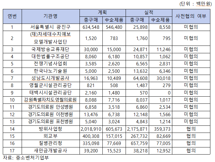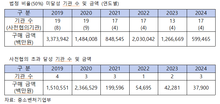 더 심각한 문제는 사전협의 제도를 악용한 편법적 운영이 만연했다는 점이다. 공공기관들은 연초 중기부와 협의하여 법정 의무 비율(50%)을 대폭 낮춘 뒤, 그 낮춘 목표를 넘어서면 ‘초과 달성’으로 통계 처리하는 수법을 사용했다.