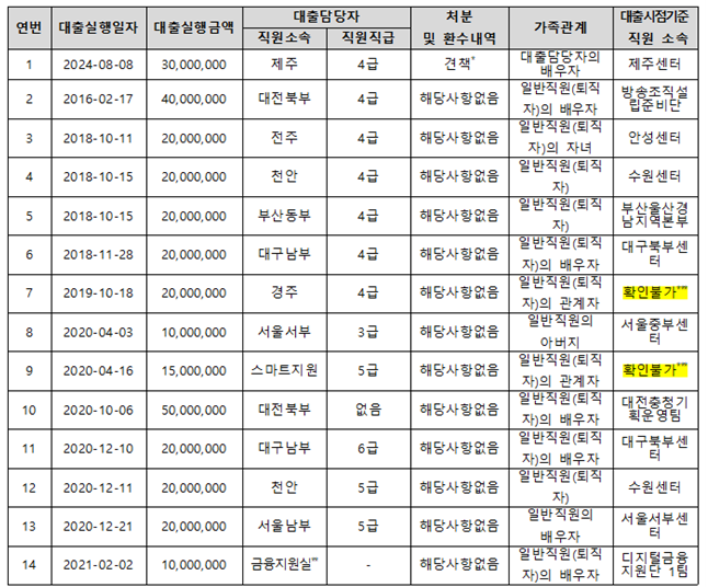 예를 들어, 어머니, 아버지, 형, 동생이 있는 경우, 전체를 다 입력할 수도 있고, 어머니만 입력할 수도 있고, 아무도 입력하지 않을 수도 있다. ‘사적이해관계 대출’ 점검의 기초가 되는 정보조차 파악이 안 되는 상황이라는 의미다.