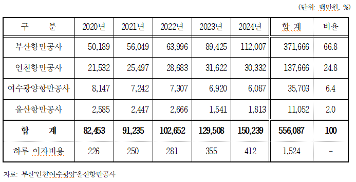 금융성 부채에 따른 4대 항만공사의 연간 이자비용은 2020년 824억 5,300만 원에서 2021년 912억 3,500만 원, 2022년 1,026억 5,200만 원, 2023년 1,295억 800만 원이다.