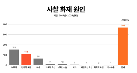 소방청이 제출한 자료에 따르면 2017년부터 2025년 8월까지 사찰 화재 중 전기적 요인으로 화재가 발생한 건수가 110건으로 전체 화재 건수의 30%를 차지했다.