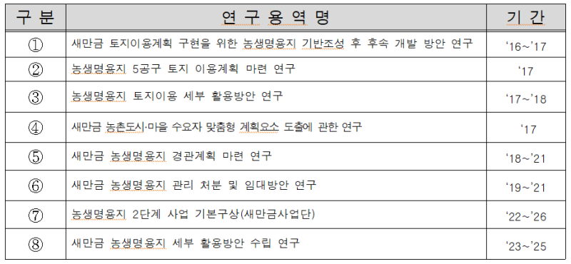 농식품부는 연구용역을 통해, 농생명용지를 복합곡물단지, 원예단지, 유기농업·조사료단지, 농업특화단지, 기능성작물단지, 농촌마을·도시, 첨단농업시험단지, 농산업클러스터, 종자생명단지, 말산업단지, 수목원, 테마파크 등으로 구분해 단계적으로 개발하겠다고 제시 했으나, 현재까지 실질적으로 추진된 사업은 복합곡물전문생산단지(499ha, 약 5.3%) 하나뿐이다.