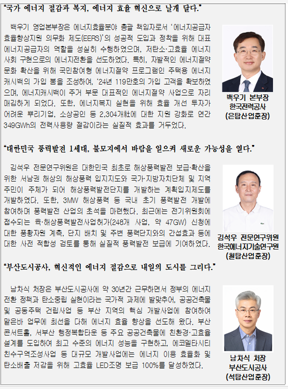 기후에너지환경부(장관 김성환)는 11월 17일 더플라자호텔(서울 중구 소재)에서 한국에너지대상 시상식을 개최하고, 에너지절약과 재생에너지 분야에서 공로가 큰 유공자 24명에게 정부포상을 수여한다고 밝혔다.