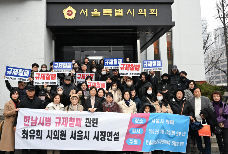 최유희 의원은 “한남시범아파트 문제는 주민이 만든 문제가 아니라 서울시 책임에서 출발한 사안”이라며, “그 부담을 다시 규제로 주민에게 떠넘기는 행정은 더 이상 정당화될 수 없다”고 밝혔다. 이어 “서울시는 공원용도 해제와 자연경관지구 규제 합리화를 통해 책임 있는 결단을 내려야 하며, 주민의 주거권 회복을 위해 끝까지 문제 해결에 나서겠다”고 강조했다.