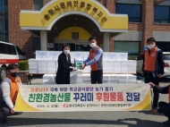 [데일리환경=이정윤 기자]  한국전력공사 순천지사가 지역 생산 농가를 돕고 취약계층에 나눔을 실천하기 위해 나섰다.  한전 순천지사는 코로나19 장기화로 초·중·고교 개학이 연기되면서 학교급식이 중단되고 사회적 거리두기와 외부활동 자제 등으로 농·축산물 판매에 어려움이 가중되자 이번 후원을 실시하게 됐다고 밝혔다. 구입한 친환경 농산물 꾸러미(삼겹살, 상추, 깻잎, 표고버섯, 고추, 마늘 등 6품목) 100상자와 마스크 150개를 순천시장애인종합복지관을 직접 방문해 전달했다. 이는 코로나19로 어려움을 겪고 있는 재가 장애인들에게 영양과 건강을 고려한 따뜻한 한 끼로 제공될 계획이다. 순천시장애인종합복지관 정한나 관장은 “코로나19로 상처받은 분들과 함께 나누고 치유하며 공동 발전할 수 있는 계기를 만들어 주신 한국전력공사 순천지사에 감사하다”고 말했다.