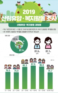 ▲ 국민 81.4% ,‘휴양ㆍ휴식’등을 위해 숲에 방문[데일리환경=안상석기자]산림청(청장 박종호)은 산림복지서비스 기반 마련 및 만족도를 높이기 위해 ‘2019 국민 산림휴양ㆍ복지활동 실태조사’를 실시하고 결과를 발표했다.우리나라 만 15세 이상 국민의 81.4%는 산림휴양ㆍ복지활동을 경험하였으며, ‘휴양과 휴식’을 위해 산림(숲)을 방문하고, 자연휴양림 시설의 이용경험과 이용의향이 가장 높은 것으로 조사됐다. 산림휴양ㆍ복지활동이란 산림(숲, 산, 공원, 도시숲 등) 또는 산림 안에 설치된 시설에서 행해지는 휴식, 취미, 문화, 예술, 창작, 체육(운동, 레포츠), 사회참여 등의 모든 활동을 말한다.이번 조사는 2020년 기준 만 15세 이상 국민 10,000명을 대상으로 2020년 7월 29일부터 9월 11일까지 1:1 대인면접조사 방식으로 실시하였으며, 활동 유형을 일상형(당일 4시간 이내), 당일형(당일 4시간 이상), 숙박형으로 구분하여 조사하였다.조사결과에 따르면, 지난 1년 동안(2019.1월~12월) 산림(숲)을 방문한 경험이 있는 국민은 81.4%이며 당일형(51.1%), 일상형(47.6%), 숙박형(30.0%) 순으로 조사되었다.성별로는 남자가 81.6%, 여자가 81.1%로 비슷했으며, 40~49세의 경험률이 87.6%로 가장 높았다. 이번 연령별 경험률은 40대(87.6%) > 50대(86.0%) > 30대(85.3%) > 10대(76.5%) > 20대(75.9%) > 60대 이상(75.7%)이다.특히 주된 방문 목적으로 일상형은 ‘건강증진을 위해서’라는 응답이 가장 높았고, 당일형과 숙박형은 ‘휴양과 휴식을 위해서’라는 응답이 높았으며, 산림(숲)에서 머무는 시간이 길어질수록 ‘취미 및 레포츠활동’을 즐기는 비중이 높아지는 경향을 보였다.또한 방문지를 선택한 이유로는 당일형, 숙박형 모두 ‘수려한 자연경관’의 비중이 가장 높았으며, 정보습득 경로는 ‘지인 및 가족추천(51.1%)’, ‘인터넷카페 및 블로그(19.4%)’, ‘포털사이트(18.1%)’ 순으로 조사되었다. 동반자로는 모든 활동유형에서 ‘가족’과 함께 하는 경우가 많았고, 활동에 대한 만족도는 모든 유형에서 89% 이상 만족한다는 응답을 하였다.일상형은 ‘가족’ 다음으로 ‘혼자서’하는 비중이 높았고, 당일형과 숙박형은 ‘가족’ 다음으로 ‘친구ㆍ연인’이 활동의 주요 동반자로 조사되었으며, 친목단체 및 직장동료 등과의 활동은 높지 않은 것으로 나타났다.또한 산림(숲)에서의 활동 만족도는 모든 유형에서 만족한다는 응답이 89% 이상으로 조사되었으며, 응답자의 97.2%가 산림휴양·복지활동이 삶에 긍정적인 영향을 미친다고 응답하였다. 산림휴양복지시설에 대한 인지도 조사결과 국민의 93.8%가 자연휴양림을 알고 있다고 답했으며, 산림욕장(73.7%), 숲길(67.5%), 치유의 숲(44.1%) 순으로 높은 인지도를 보였다. 산림청 측은"실제 산림휴양복지시설을 이용해 본 경험으로는 자연휴양림(41.3%), 숲길(26.3%), 수목원(27.3%), 산림욕장(17.4%) 순으로 조사되었으며, 향후 산림휴양복지시설의 이용 의향을 묻는 응답에서는 ‘자연휴양림’, ‘숲길’, ‘산림욕장’, ‘치유의 숲’, ‘수목원’, ‘숲속야영장’ 순으로 나타났다" 고 설명했다 산림청 이상익 산림복지국장은 “ 산림휴양ㆍ복지활동 수요가 지속해서 늘어날 것으로 전망하고, 산림휴양ㆍ복지 활성화를 위한 다양한 정책을 마련하고 새로운 환경사업을 발굴해 나가겠다”라고 밝혔다.