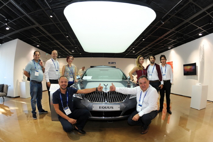 사진 2. 딜러 사장단들이 9일 대치 H-Art 지점을 방문해 에쿠스 차량 앞에서 기념촬영을 하고 있는 모습