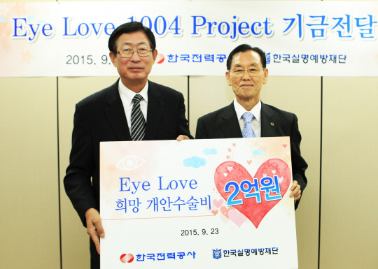 한국전력은 23일 한전 아트센터에서 개안수술을 통해 실명위기 환자에게 빛을 찾아주는 맞춤형 희망 프로젝트의 일환으로 한국실명예방재단에 시각장애우들을 위한 수술비 2억 원을 전달했다고 밝혔다.