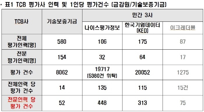 22일 민병두 의원(새정치민주연합)이 금융감독원과 기술보증기금을 통해 제출받은 ‘TCB평가사의 인력 현황을 분석한 결과 지난해 6월부터 올 6월까지 9개월 간 TCB평가사의 전문평가인력 1인 당 평가 건수가 민간평가사인 나이스는 448건, 한국기업데이터(KED)는 313건에 이르렀다고 밝혔다.