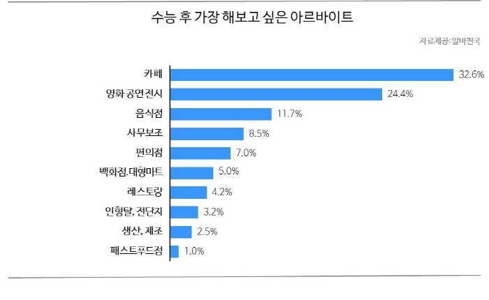 대다수의 수험생들이 수능 후 아르바이트를 계획하고 있는 가운데, 이들이 가장해보고 싶은 첫 알바로는 ‘카페알바’가 32.6%로 1위를 차지했으며. 이어 ‘영화, 공연, 전시 알바’가 24.4%로 2위에 올랐다.