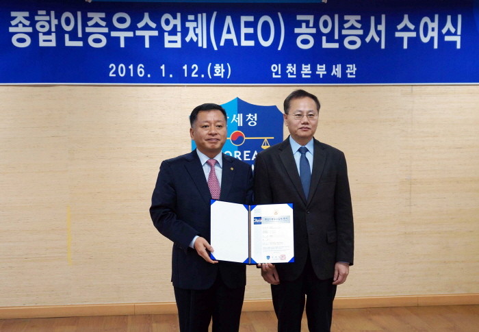 인천본부세관에서 열린 2015년 제 4회 종합인증우수업체 공인증서 수여식에는 쌍용자동차 구매1담당 박경원 상무가 참석해 차두삼 인천본부세관장으로부터 수출입 부문 AEO 공인증서를 수여받았다.