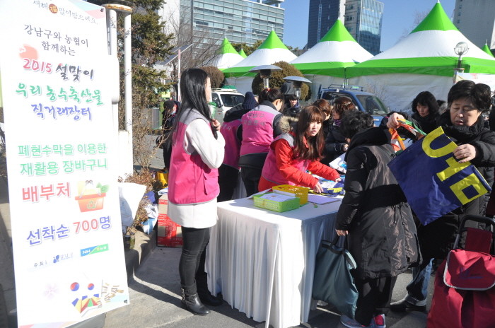 강남구(구청장 신연희)는 버려지는 폐현수막을 재활용해 ‘힐링 백 장바구니’를 만들어 다음 달 설맞이 강남구 직거래 장터를 찾는 주민 500여 명에게 무료로 나눠준다고 최근 밝혔다.
