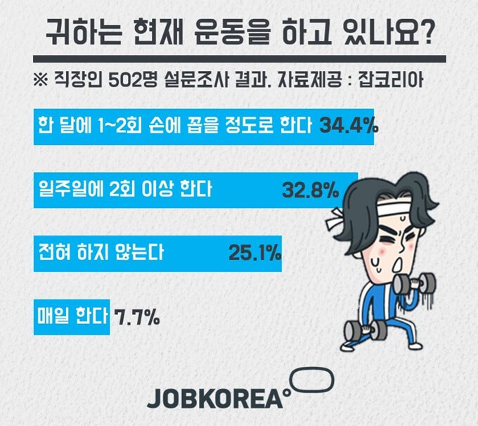 잡코리아가 직장인들에게 ‘현재 운동을 하고 있는지’ 물었다. 그러자 ‘한 달에 1~2번 손에 꼽을 정도로 한다(34.4%)’, ‘일주일에 2회 이상 한다(32.8%)’, ‘매일 한다(7.7%)’ 등 운동을 한다는 답변이 74.9%를 기록했다. 하지만 ‘매일 한다(7.7%)’는 답변이 낮은 응답률을 기록했고 ‘전혀 하지 않는다’는 답변도 25.1%를 기록해 꾸준히 운동을 하는 직장인이 적다는 점을 확인할 수 있었다.