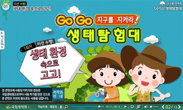 ‘지구를 지켜라! 고고 생태탐험대’는 국립생태원에서 수행한 ‘사이버 생태교육 콘텐츠 제작사업’의 일환으로 지난해 11월에 개발됐다. 시범운영을 거쳐 이달 14일부터 국립생태원 누리집 이러닝 코너에 무료로 공개된다.
