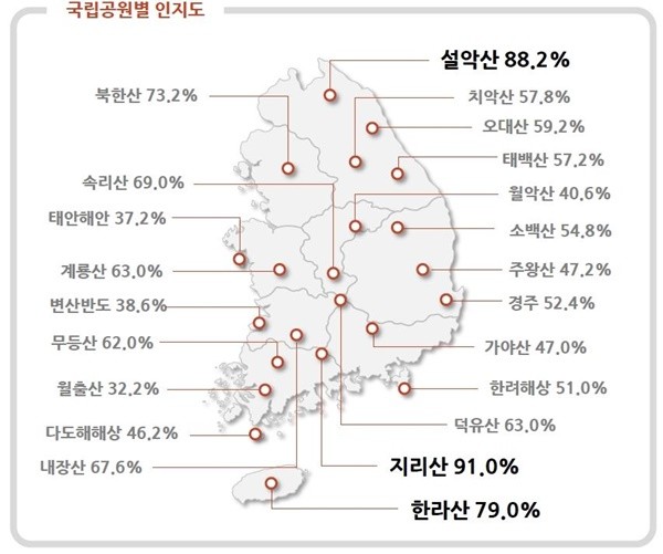 통계에 따르면 현재 전국의 국립공원 수는 지난해 8월 22일 지정된 태백산을 포함해 전국에 총 22곳이 있다. 총 면적은 6726㎢로 육지 면적(3972㎢) 기준으로 전체 국토 면적(10만339㎢)의 3.96%를 차지한다.