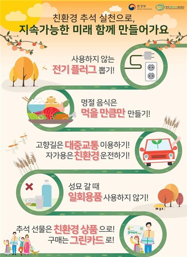친환경 명절 보내기 실천수칙 5가지는 ▲사용하지 않는 전기 플러그 뽑기 ▲명절 음식은 먹을 만큼만 만들기 ▲고향길은 대중교통 이용하기, 자가용은 친환경 운전하기 ▲성묘갈 때 일회용품 사용하지 않기 ▲추석 선물은 친환경 상품으로, 구매는 그린카드로 등이다.