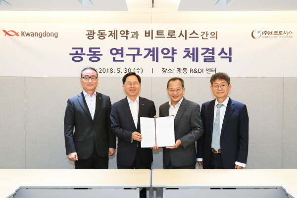 광동제약(대표이사 최성원)은 30일 생명공학 바이오벤처 기업 비트로시스(대표이사 박철수)와 바이오 신소재 개발 협력을 위한 공동 연구계약을 체결했다고 최근밝혔다.