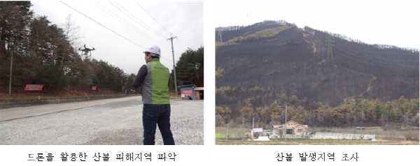 한국시설안전공단은 산불이 진화됨과 동시에 지반·지질 등 비탈면 분야 전문가로 점검팀을 구성하고 최첨단 드론을 활용하여 산불발생지역을 파악함과 동시에 비탈면 상태 및 시설물의 손상정도 등을 점검하였다.
