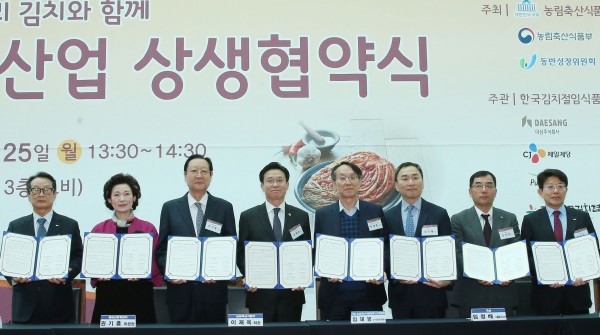 농림축산식품부 이재욱 차관은 11월 25일 국회 농림축산식품해양수산위원회 임재봉 수석전문위원, 동반성장위원회 권기홍 위원장 및 김치 대·중소기업과 함께 김치산업 진흥과 시장 활성화를 위한 상생협약을 체결하였다.