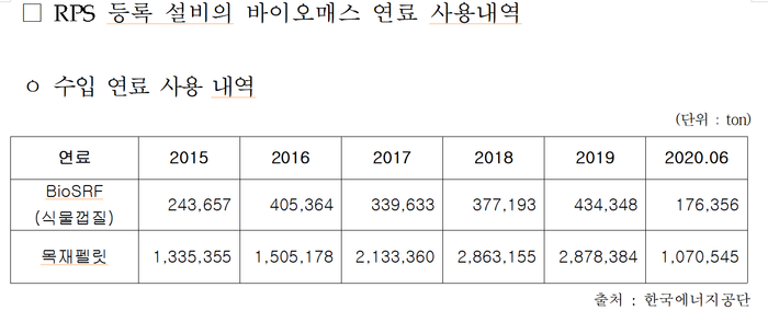 국회 산업통상자원중소벤처기업위원회 소속 이성만 의원(더불어민주당‧부평갑)이 한국에너지공단으로부터 받은 ‘RPS 등록설비 바이오매스 연료 사용내역’에 따르면, 지난해 목재펠릿 사용량 304만2,894톤 중 수입산은 287만8,384톤으로 94.6%를 차지하는 반면 국내산은 16만4,510톤 밖에 사용하지 않은 것으로 나타났다.
