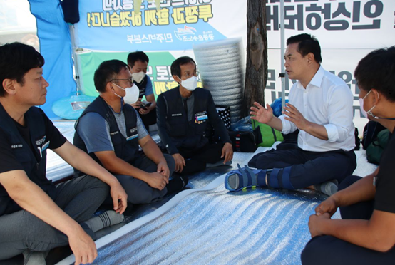 이날 현장 간담회에는 박영순 의원과 민주노총 공공운수노조 화물연대 이봉주 위원장, 오남준 부위원장, 화물연대 대전지부 김경선본부장, 하이트진로지부 이진수 부지부장이 참석했다.