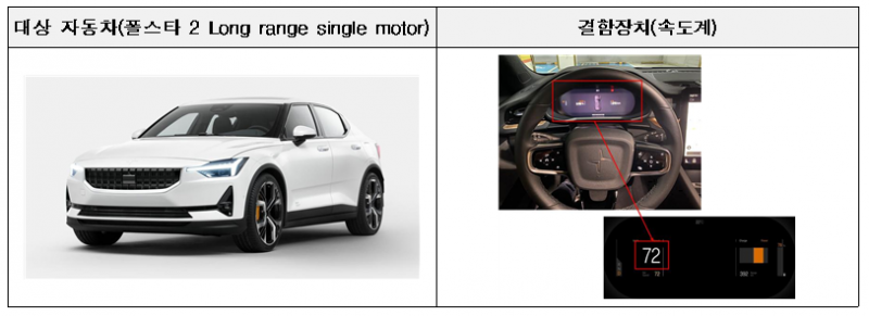 ㈜볼보자동차코리아에서 수입, 판매한 XC60 등 9개 차종 58,165대와 폴스타오토모티브코리아(유)에서 수입, 판매한 폴스타 2 Long range single motor 등 2개 차종 2,410대는 계기판 소프트웨어의 오류로 계기판에 표시되는 차량 속도가 실제 차량 속도보다 낮게 표시되는 안전기준 부적합 사항이 확인되어 우선 수입사에서 자발적으로 시정조치(리콜)를 진행하고, 추후 시정률 등을 감안하여 과징금을 부과할 계획이다.