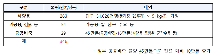 한편, 농협은 올해 작황 및 재배면적 고려할 때 쌀 생산량을 ‘379~385만톤’으로 전망하고 있으며, 소비량 감소 등을 고려할 때 신곡 수요는 ‘346만톤’ 내외로 추정하고 있다