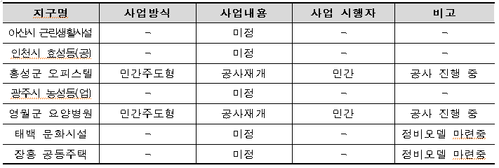 이에 국토부는 공사중단 방치건축물의 경우 이해관계자 간 소송 및 채권 문제 등 복잡한 권리관계가 형성되어 있으며, 자금 및 사업성 부족 등의 금전적 문제로 공사가 대부분 중단됨에 따라 정비환경사업 추진에 어려움이 존재한다고 설명하고 있다.